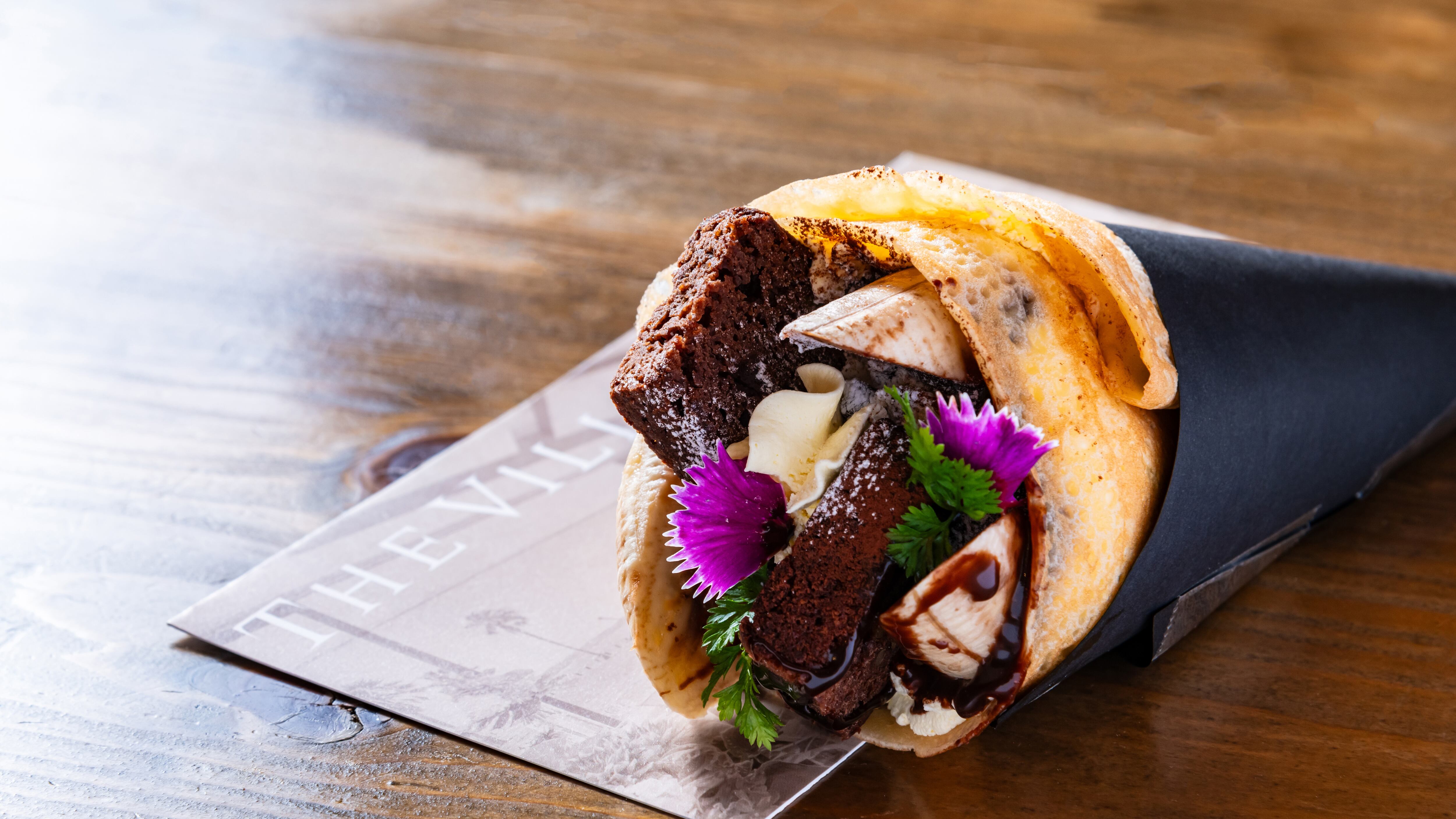 甘くてリッチな味わいが魅力のクレープ。バナナの自然な甘さと、濃厚なチョコレートの絶妙なバランスが絶品です。その上にたっぷりとトッピングされた生クリームが、さらに豪華な味わいを演出します。ぜひ、贅沢な味わいをご堪能ください。